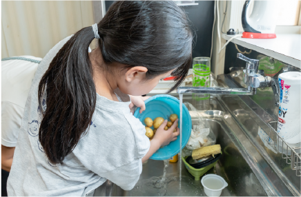 キッチンでは、クッキングの日に希望する子どもがスタッフのサポートのもとで調理を体験できます。また、持参したお弁当を温めることもできます。